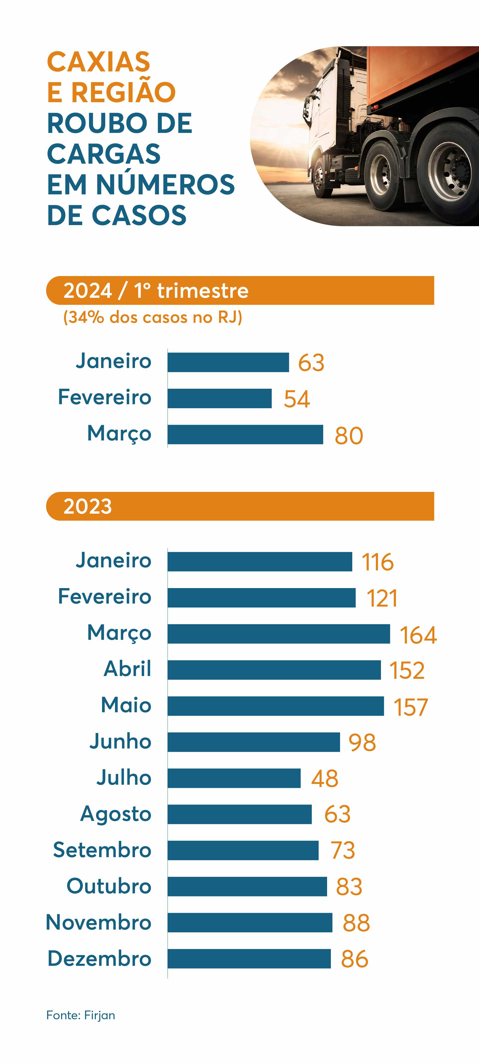 “Sabemos das dificuldades do governo por falta de pessoal, de policiais para estarem mais presentes e combaterem esse crime. Durante a atuação da força militar do governo federal, conseguimos perceber uma melhora”, contabiliza o empresário. Após quatro anos de reduções sucessivas, a Regional Caxias registrou crescimento no número de ocorrências de roubo de carga em 2022 e 2023. Os meses de março, abril e maio do ano passado marcaram a máxima de casos mensais do ano, com 164, 152 e 157 casos, respectivamente. Este ano, entretanto, os números voltaram a cair.