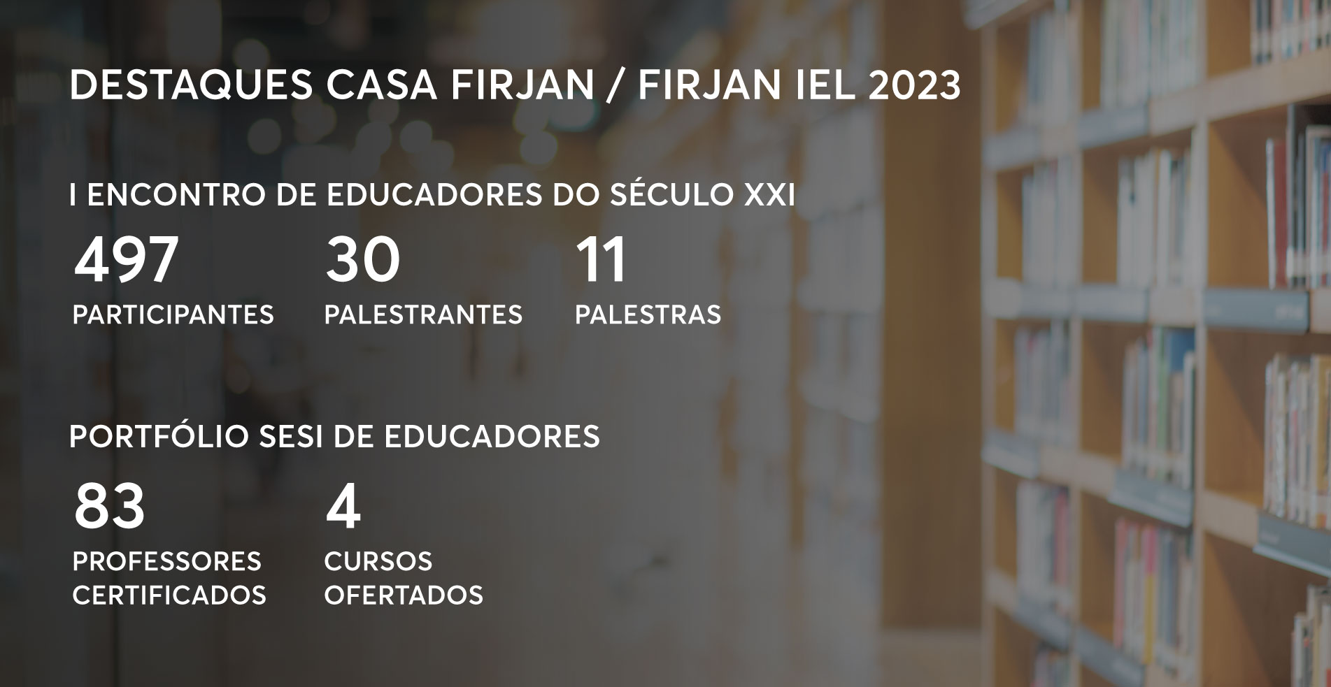 A Firjan, a Casa Firjan e a Firjan IEL realizaram diversas ações em 2023, que priorizaram a inovação, a educação, as novas tendências, os avanços da tecnologia, a história da indústria e atividades criativas e artísticas. Podemos destacar: as Caravanas e Imersões Sindicais e Empresariais, o Festival Futuros Possíveis, o BIN@Rio, o I Encontro de Educadores do Século XXI como marco do lançamento do Portfólio SESI de Educadores, as Rodadas de Inovação, a Exposição Granado, os Eventos Casa Aberta e o novo Fab Lab. Confira abaixo.