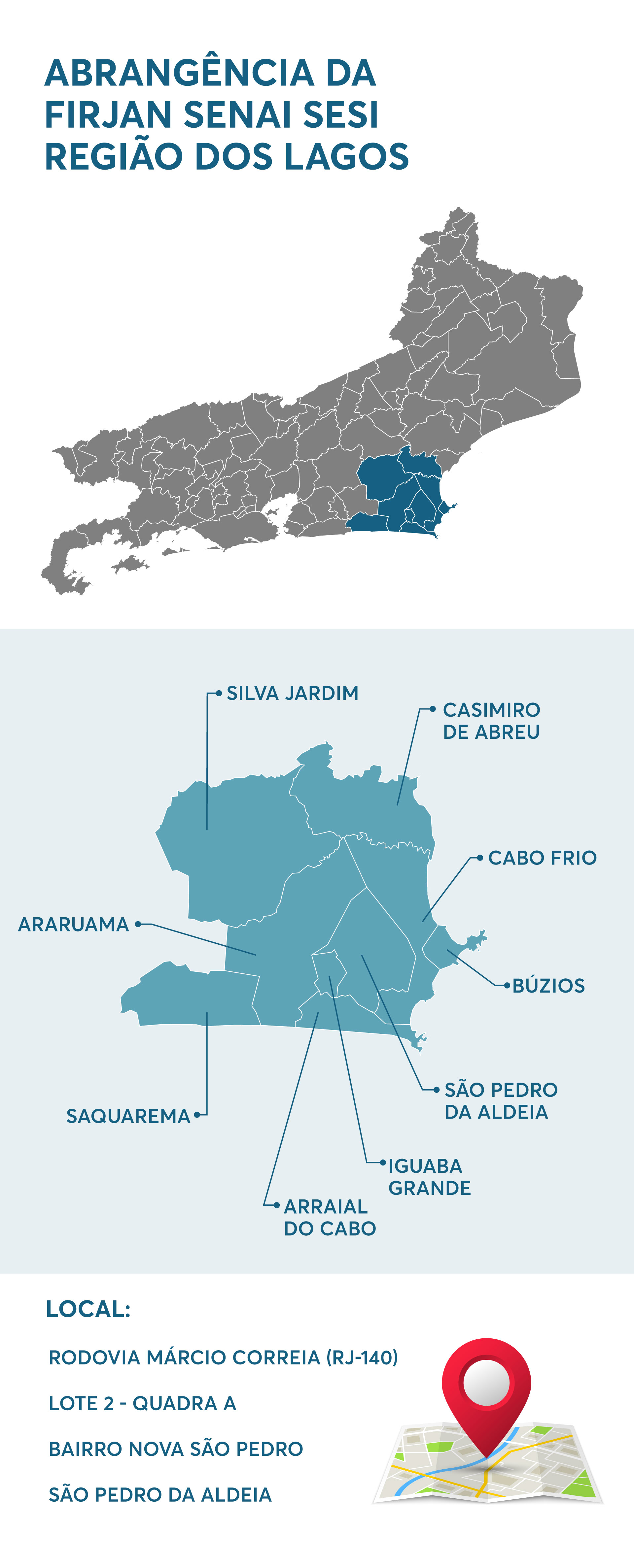 A Firjan SENAI SESI Região dos Lagos vai atender, além de São Pedro da Aldeia, outros oito municípios: Araruama, Arraial do Cabo, Búzios, Cabo Frio, Casimiro de Abreu, Iguaba Grande, Saquarema e Silva Jardim. Rio das Ostras já vem sendo atendido pela unidade Macaé, que é mais próxima ao município.