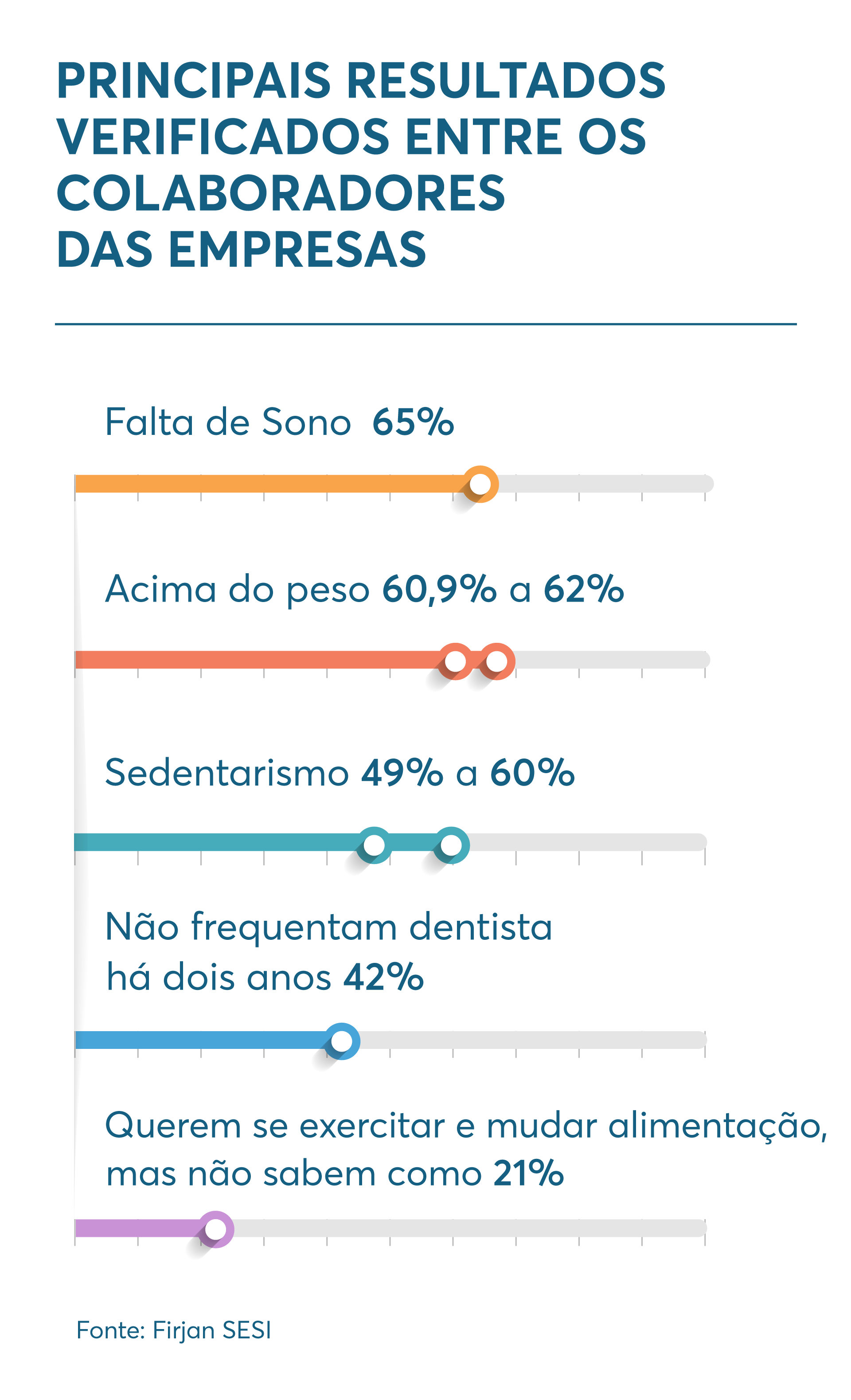 George Paiva, responsável pelo RH da Orange, integradora digital presente em 221 países, também se surpreendeu com o resultado do estudo realizado pela Firjan SESI na empresa, situada em Petrópolis, Região Serrana do estado do Rio. Apesar de oferecer Gympass (auxílio academia), frutas durante o expediente, plano médico e odontológico, modelo híbrido de trabalho – oito dias no escritório e 12 em casa – e ginástica laboral, entre outros benefícios, 60,9% dos trabalhadores estão acima do peso e 65% sofrem com a qualidade do sono e questões de saúde mental. O sedentarismo atinge 49% dos colaboradores e 42% não passaram por um dentista nos dois anos anteriores.