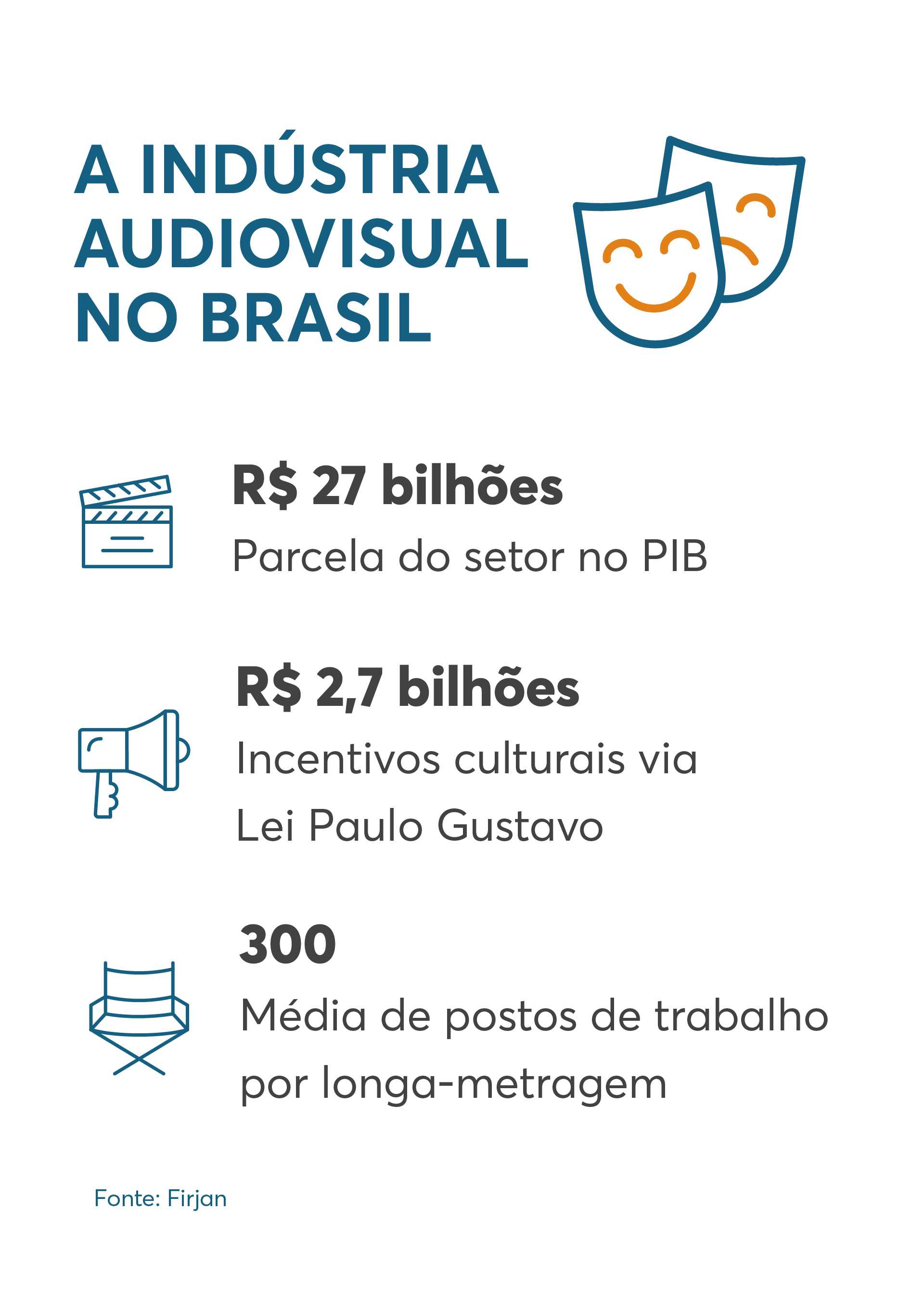 A indústria audiovisual recebeu recentemente uma injeção de ânimo com a sanção da Lei de Cotas de exibição de conteúdo nacional nos cinemas e na TV paga, conhecida como “cota de tela”. Por sua vez, a Lei Paulo Gustavo movimenta mais de R$ 2,7 bilhões no país. Estima-se que o setor contribua com mais de R$ 27 bilhões para o PIB brasileiro. Aliado a esses números, o levantamento “O impacto econômico do audiovisual na América Latina” (Netflix/Deloitte) prevê um crescimento anual de 7,2% da indústria audiovisual mundial até 2030.