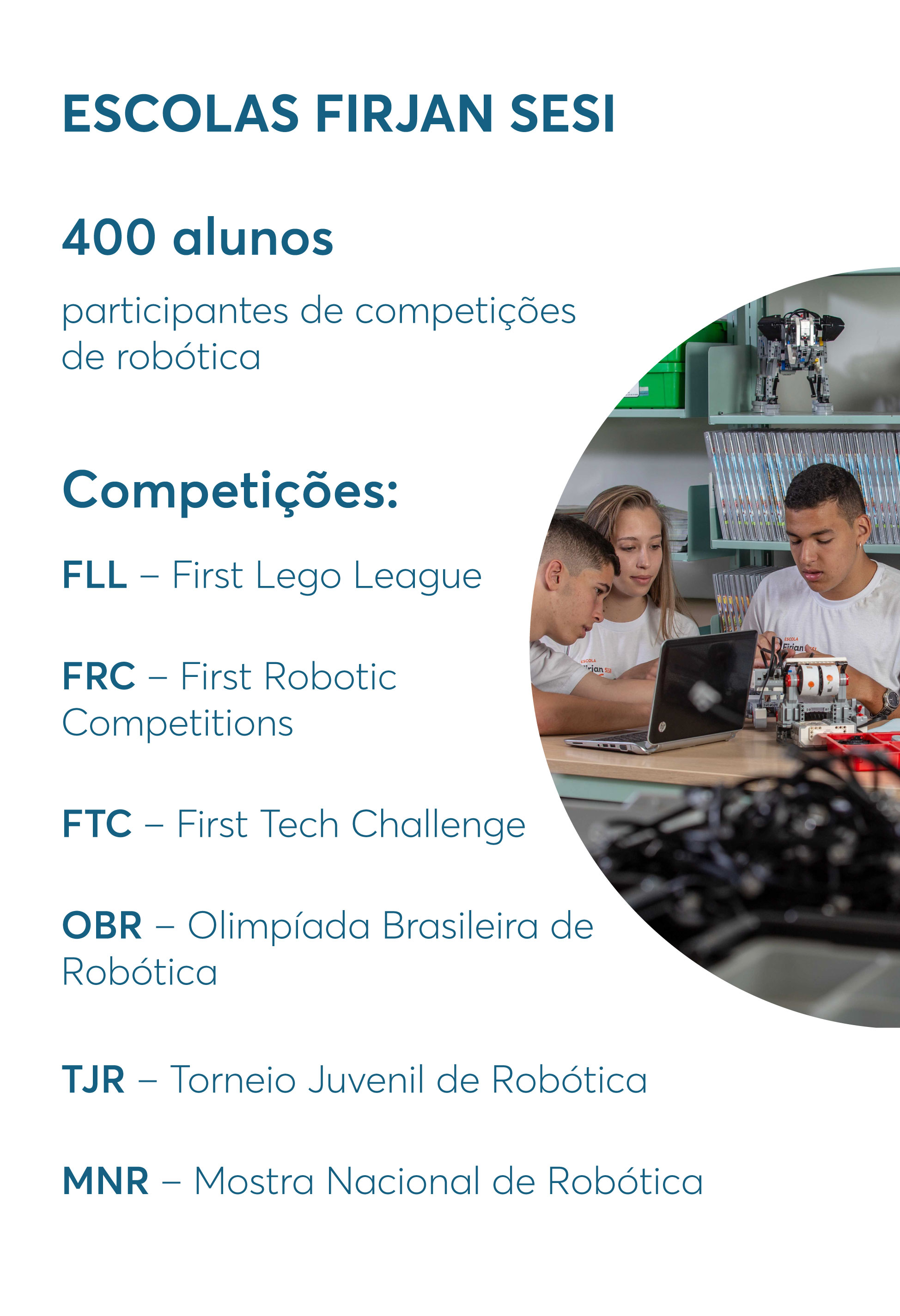 Os alunos começam construindo com lego e depois usam material industrial. Os estudantes participam também de várias competições municipais, estaduais, nacionais e internacionais: First Lego League (FLL), First Robotic Competitions (FRC), First Tech Challenge (FTC), Olimpíada Brasileira de Robótica (OBR), Torneio Juvenil de Robótica (TJR) e Mostra Nacional de Robótica (MNR).