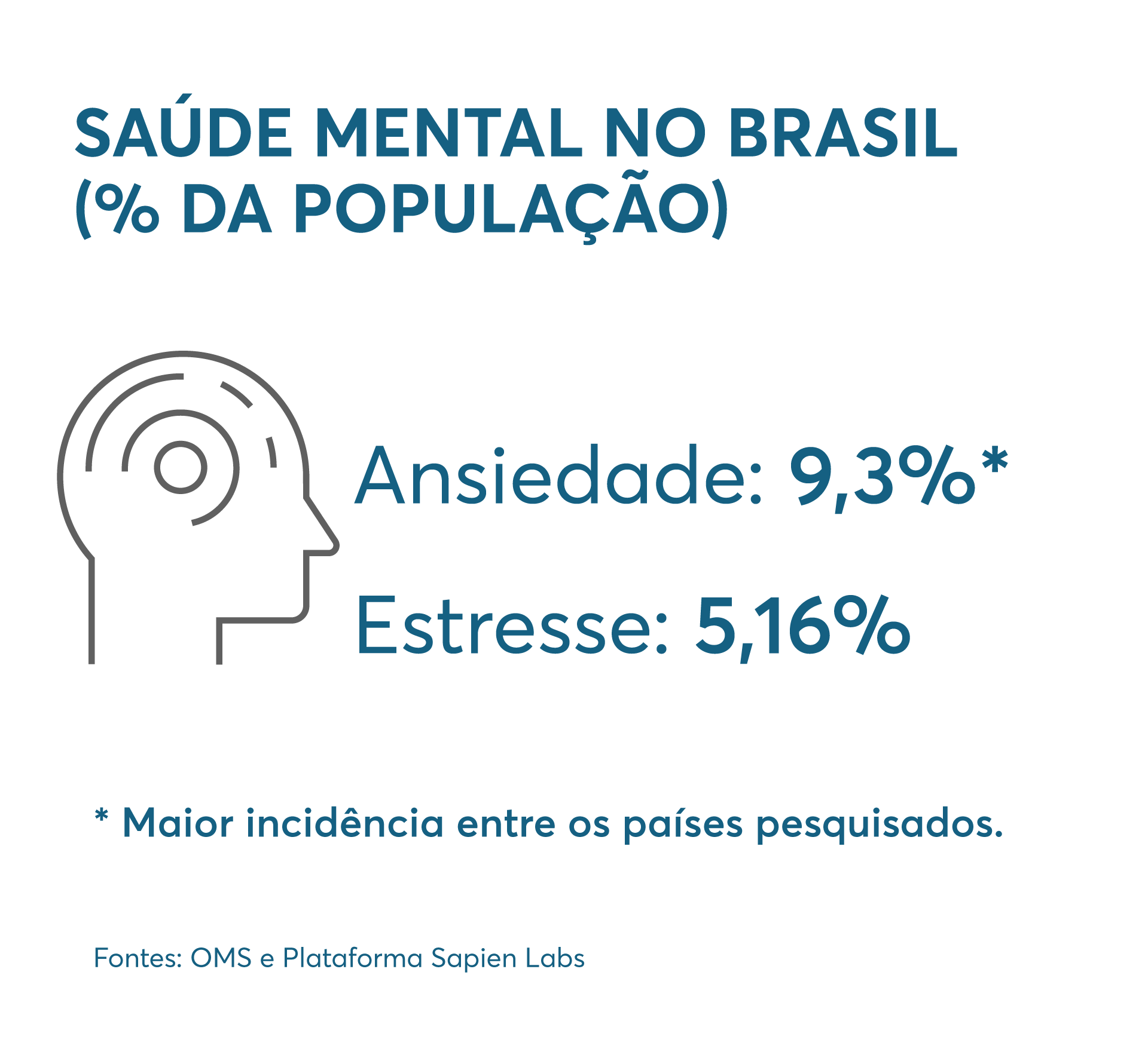Antes mesmo da pandemia, o Brasil já ocupava as primeiras posições no ranking de transtornos mentais. Atualmente, segundo a Organização Mundial da Saúde (OMS), 9,3% dos brasileiros sofrem com transtornos de ansiedade. O país ainda tem a maior prevalência de depressão na América Latina, de acordo com o relatório “Depressão e outros transtornos mentais”, também da OMS, publicado em 2022.