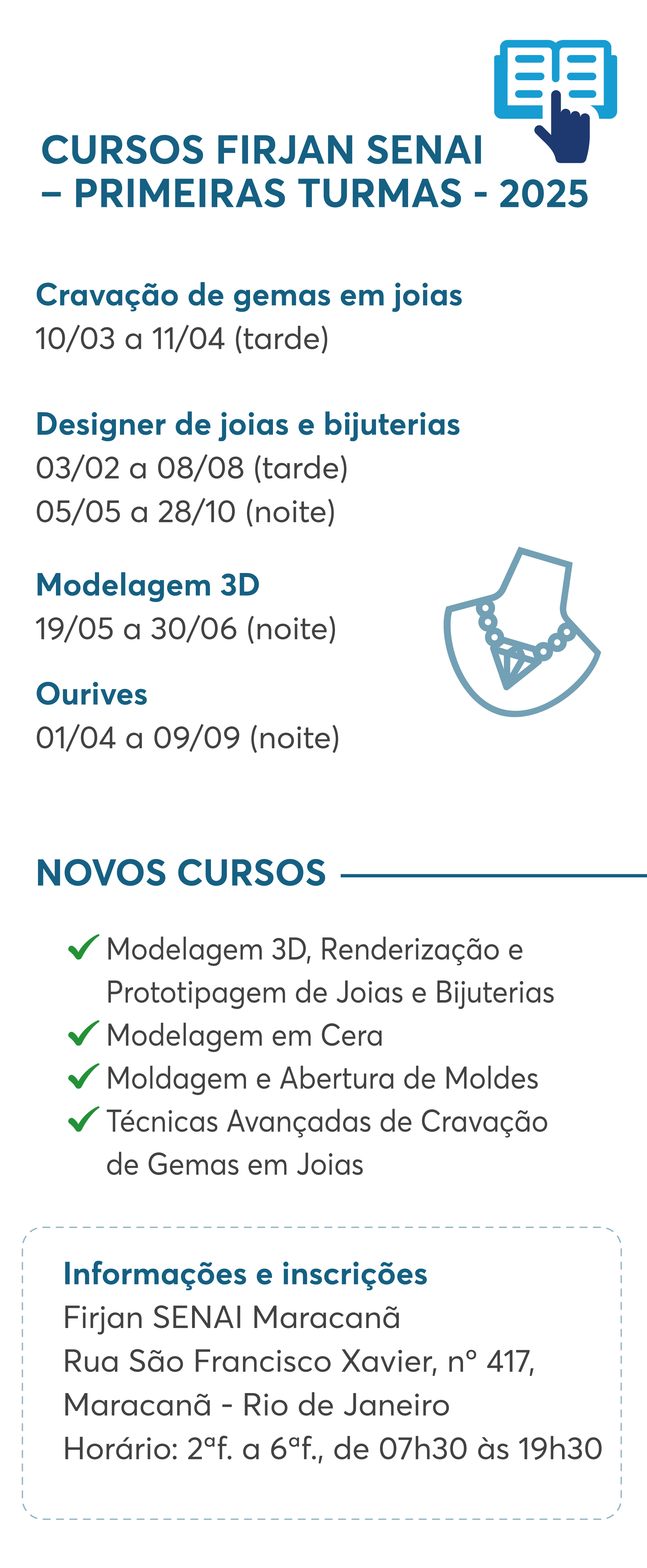 “Para atender a todas essas necessidades, hoje a Firjan SENAI tem o curso de Ourivesaria, que abrange o contato do aluno com a parte teórica e técnica da banca. Nesse curso, ele aprende história da joalheria, matemática aplicada à joalheria e metalurgia. Na banca desenvolve o processo de fabricação de uma joia do zero, desde pegar uma chapa e transformar numa joia”, explica Emerson Marcelo da Cunha, instrutor especialista em joalheria na Firjan SENAI Maracanã.
