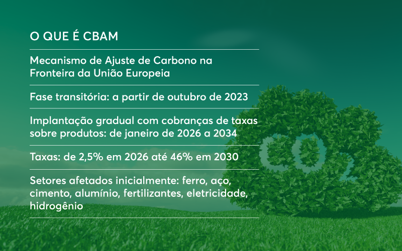 As empresas importadoras dentro da UE terão que comprar os chamados certificados CBAM e pagar a diferença entre o preço do carbono no país de produção e o das licenças de carbono do Sistema de Comércio de Emissões (ETS, na sigla original) europeu. Em outubro deste ano, começa um período transitório do CBAM e, em 1º de janeiro de 2026, as primeiras cobranças, que devem variar de 2,5% até 46% em 2034. Os primeiros setores a serem atingidos são: ferro, aço, cimento, alumínio, fertilizantes, eletricidade, hidrogênio, bem como emissões indiretas em determinadas condições.