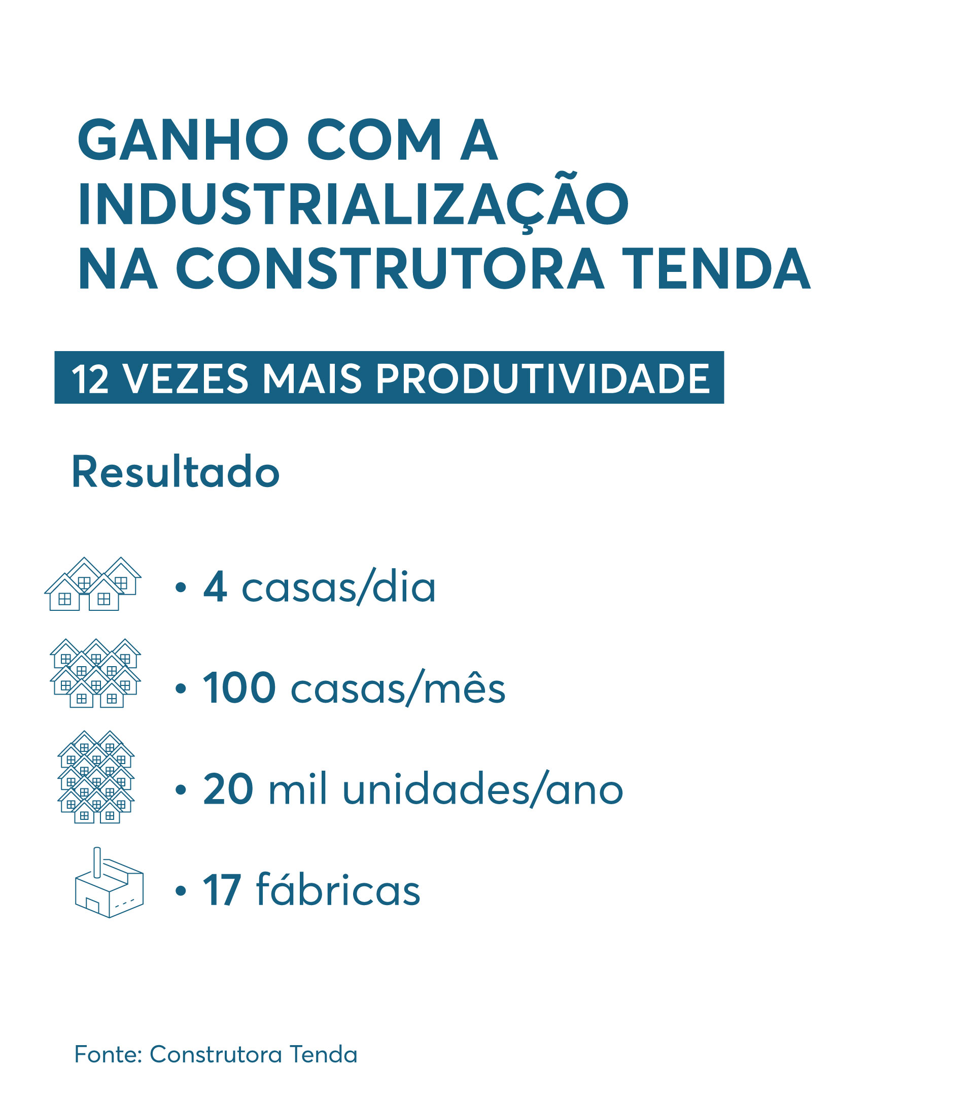 A linha de montagem da Tenda, incorporadora voltada para habitação de interesse social, com foco no programa “Minha Casa, Minha Vida”, utiliza tecnologia construtiva para que cada uma de suas 17 fábricas produza 100 apartamentos por mês ou 1.200 por ano. No total, as fábricas entregam mais de 20 mil unidades a cada ano.